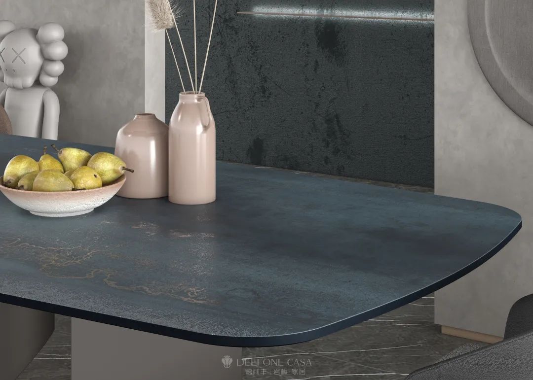 20mm钛金蓝岩板餐桌,深邃的蓝色纹理与复古的钛金质感相融合,仿佛镌刻着所有美好的瞬间,温馨而充满回忆感。