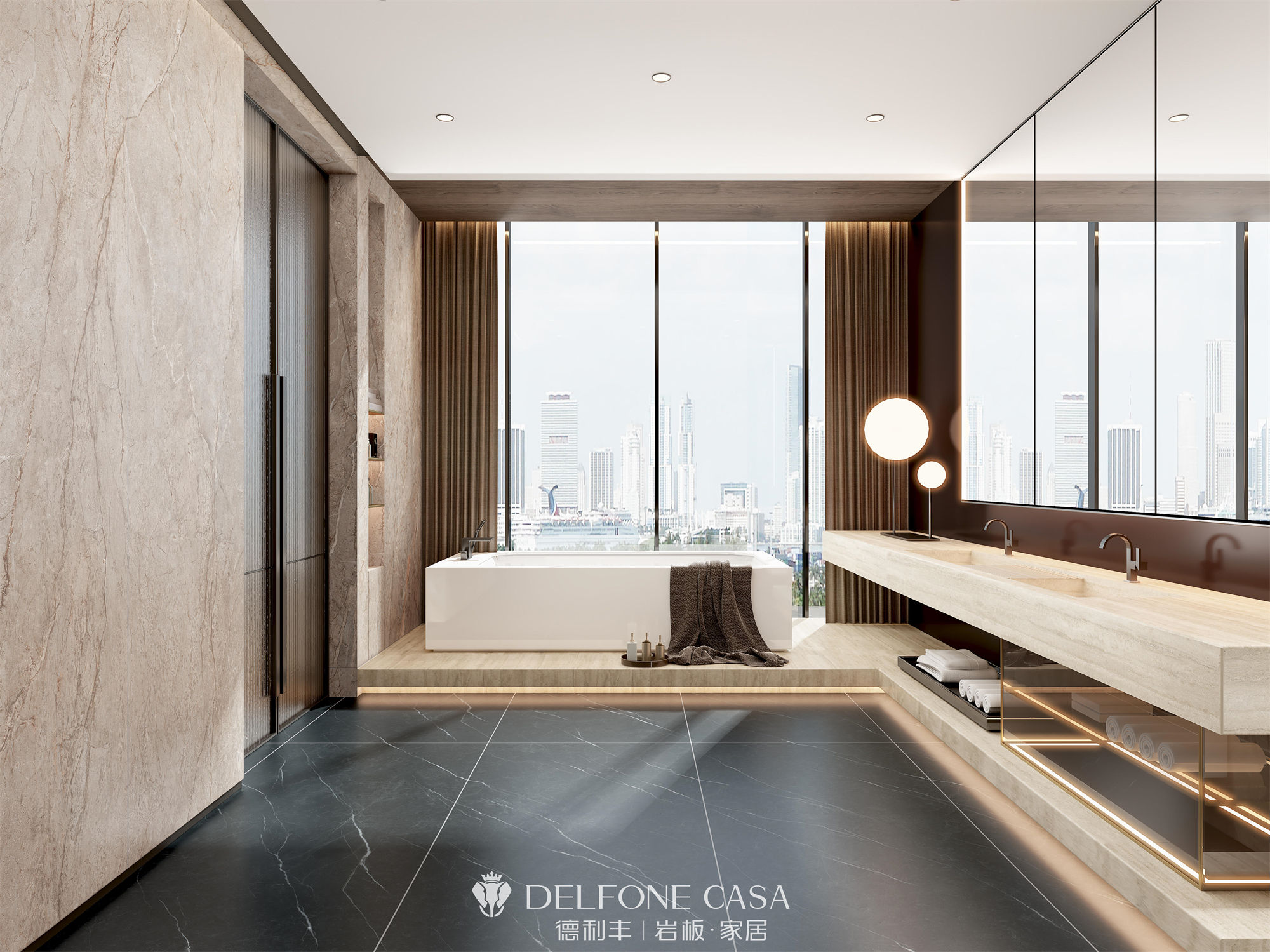 主材:水磨石浅灰、波西尼亚灰、罗马黑金石、卡拉卡塔白、洞石米黄