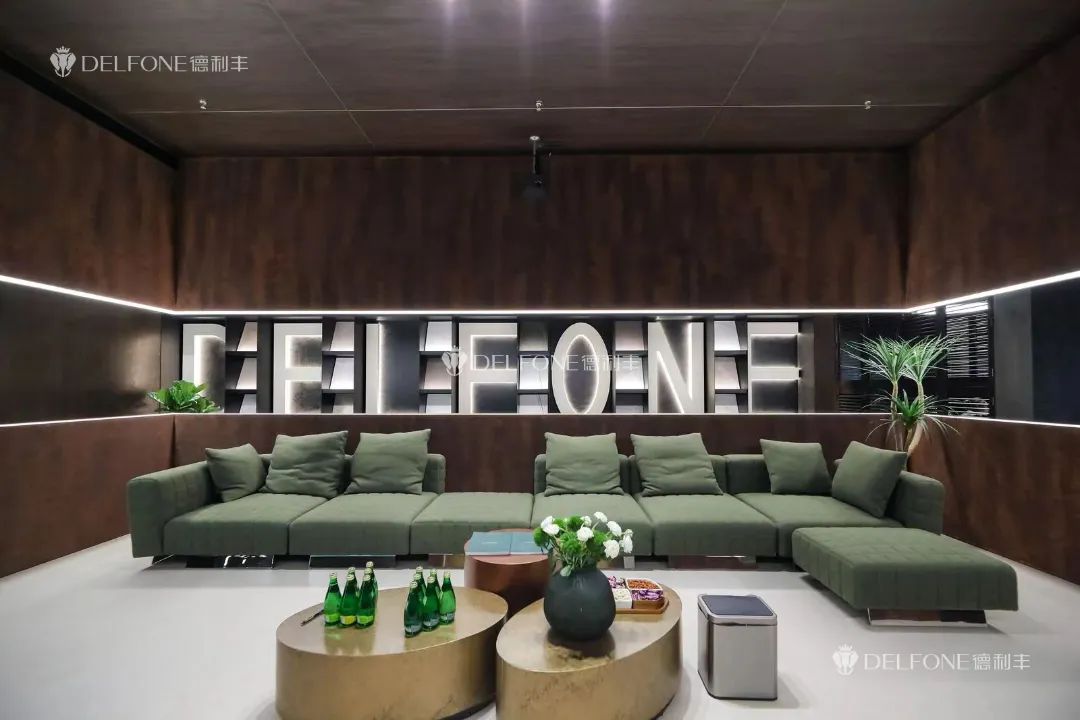 接待厅的沙发背景墙定制的符号装置巧妙构思,从德利丰品牌视觉符号中提炼出恰当的延展图形并以三维化的表达手法结合光影重塑,将德利丰的英文名陈列于消费者的第一视角,形成最直观的品牌认知。